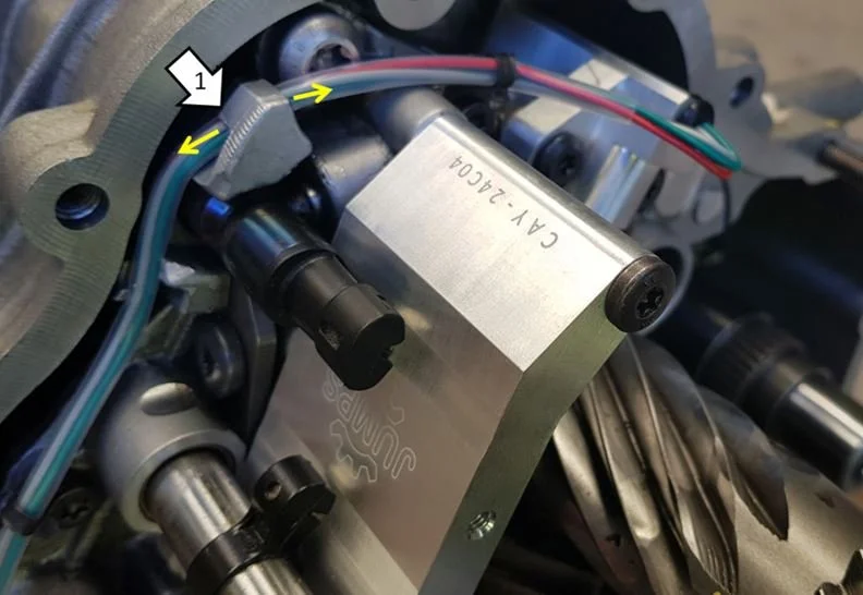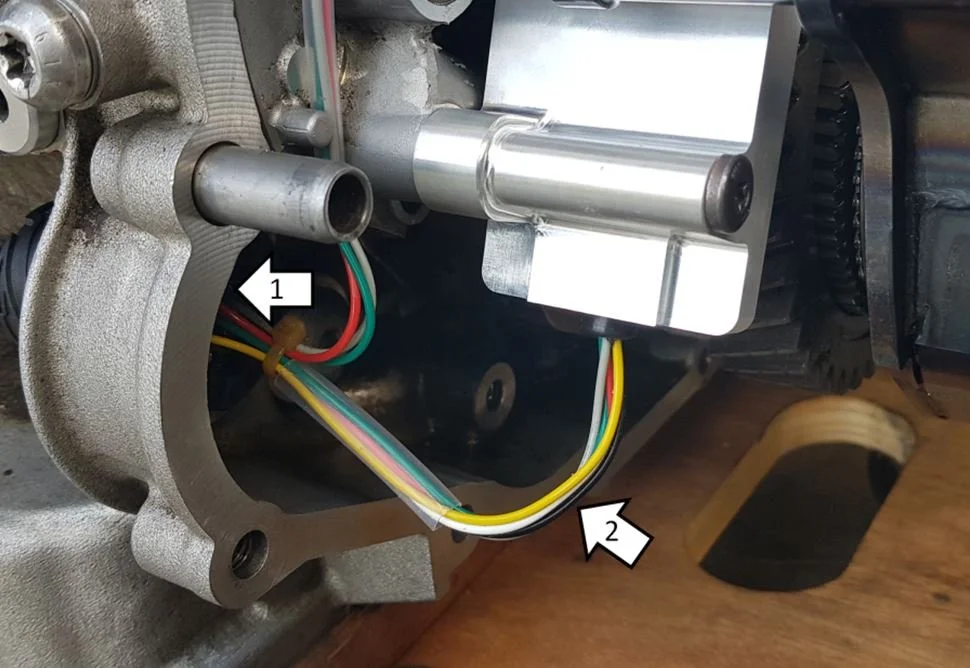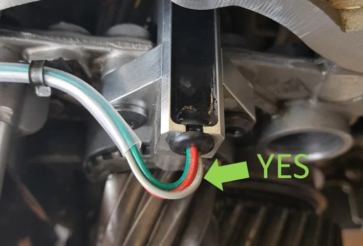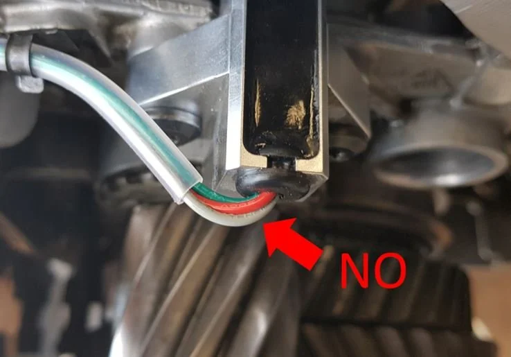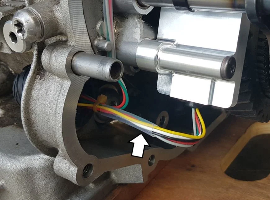 It is critical that the tubing is held in position 7 and doesn’t slip out, which can result in the wiring being pinched by the rear casing when installed. You may consider cleaning this area with solvent to ensure the residual gear oil is removed and ensure the tubing is held firmly in place.