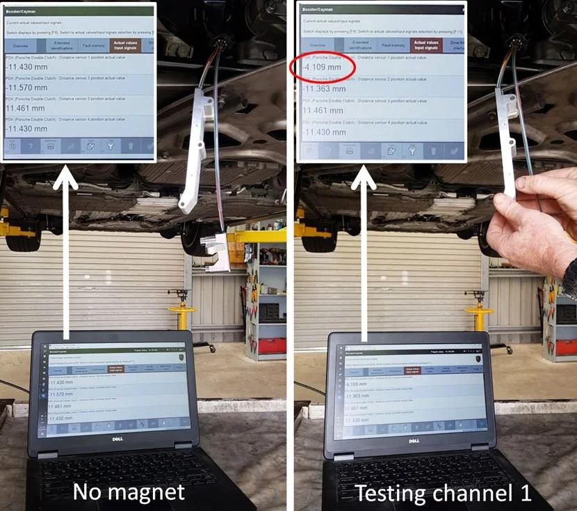 1) With PIWIS connected and monitoring Shift Rod actual values, disconnect the lower transmission plug and connect the new sensor. Each channel should read approximately 11mm (+ or -).